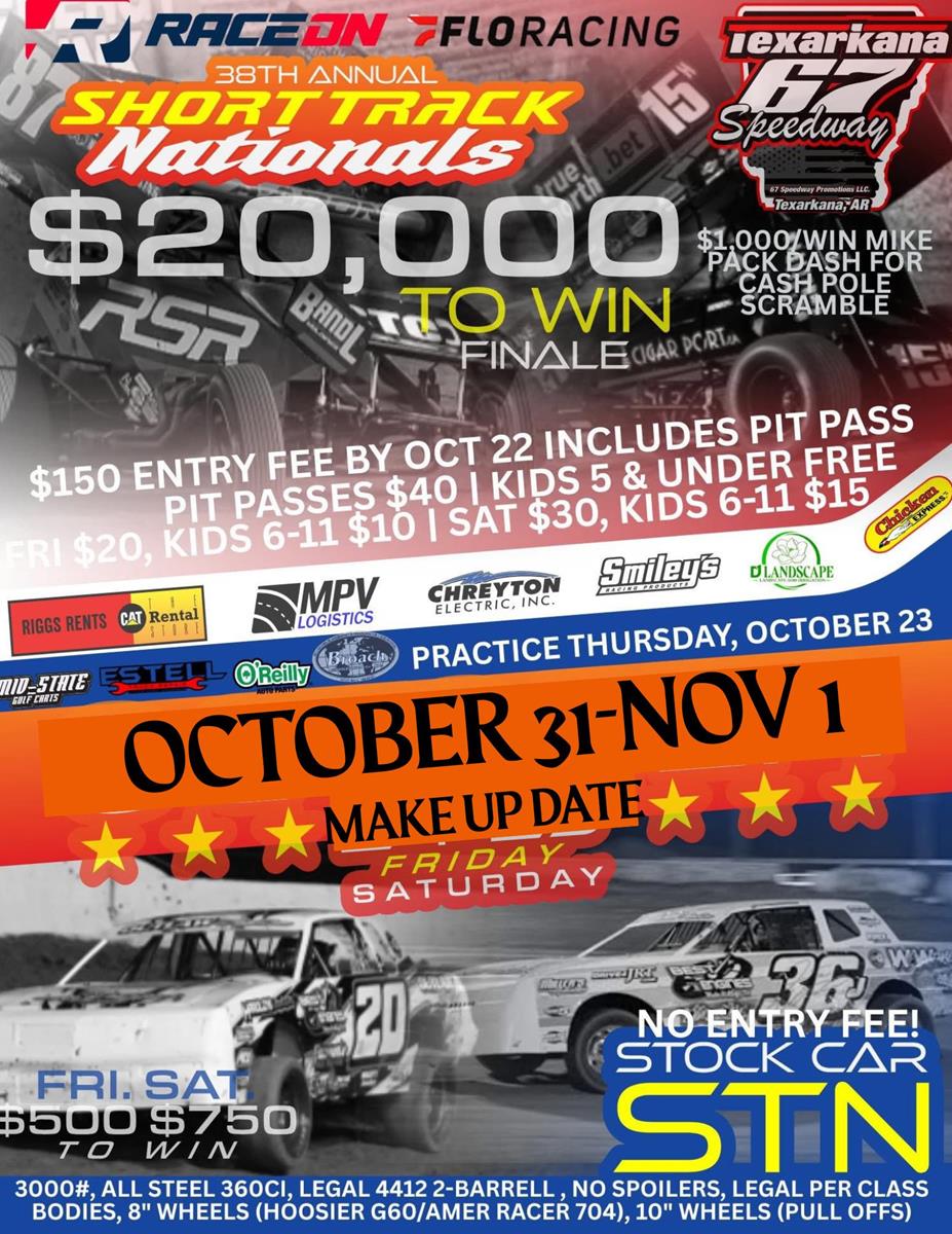 38th Annual Short Track Nationals presented by D1 Landscape, MPV Express, Riggs Rents of Texarkana, KNP Painting, Mid-State Golf Cars, O’Reilly, Estell Truck Repair, Chreyton Electric, Broach Refrigeration, Smiley’s Racing, Chicken Express, Hoosier Racing Tires, RaceOn and Flo Racing.